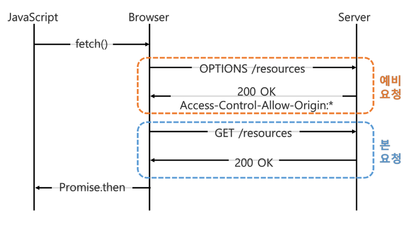 - 예비요청을 통해 Access-Control-Allow-Origin 헤더를 포함한 응답을 브라우저는 받고 헤더를 확인 후 CORS 동작을 수행할지 판단