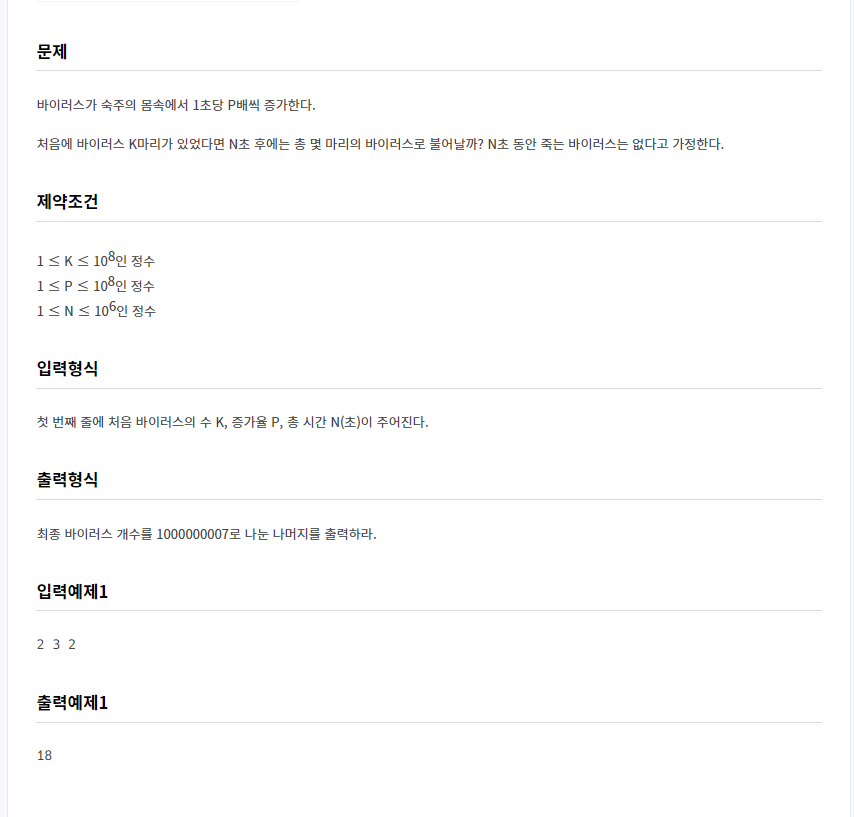 문제를 보고 구현을 해보면 k*(p^n)의 식이 성립이 되는데, 이는 수가 너무 커져서 시간초과의 큰 요인이됨