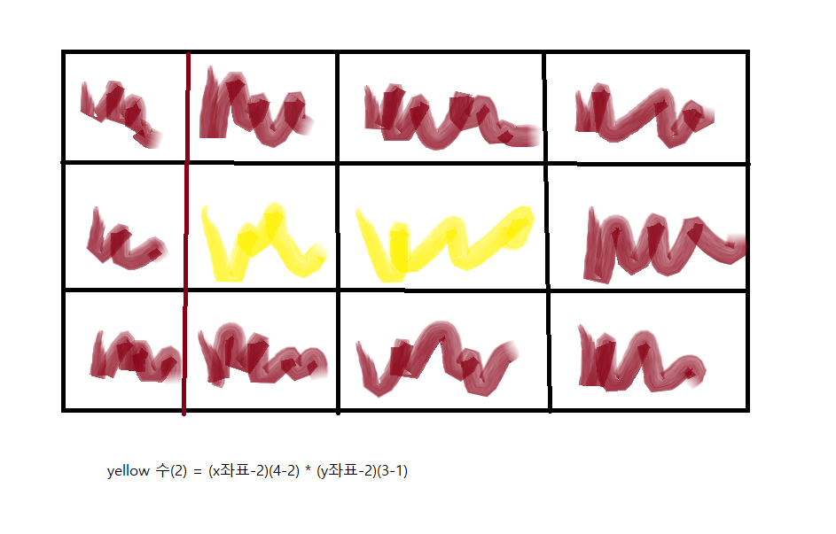 그렇다면 yellow를 구하는 식은 (y좌표-2)*(x좌표-2)가 된다 (가장자리의 brown의 공간을 빼줌)